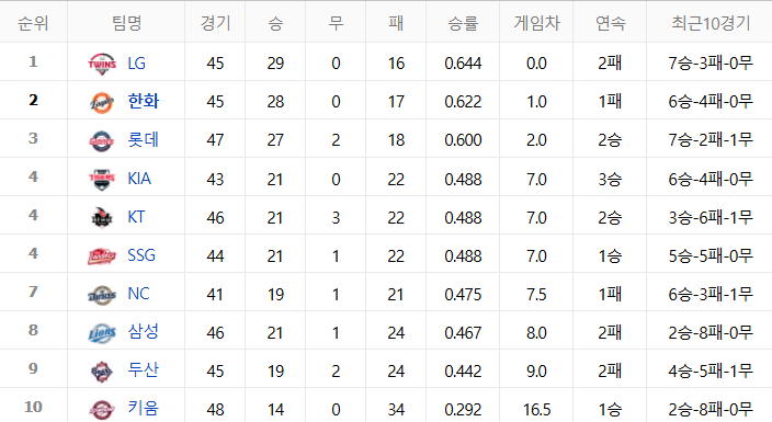 한화이글스는 45경기에서 28승 0 무 17패로 1위 엘지와는 1 게임차밖에 안 된다.