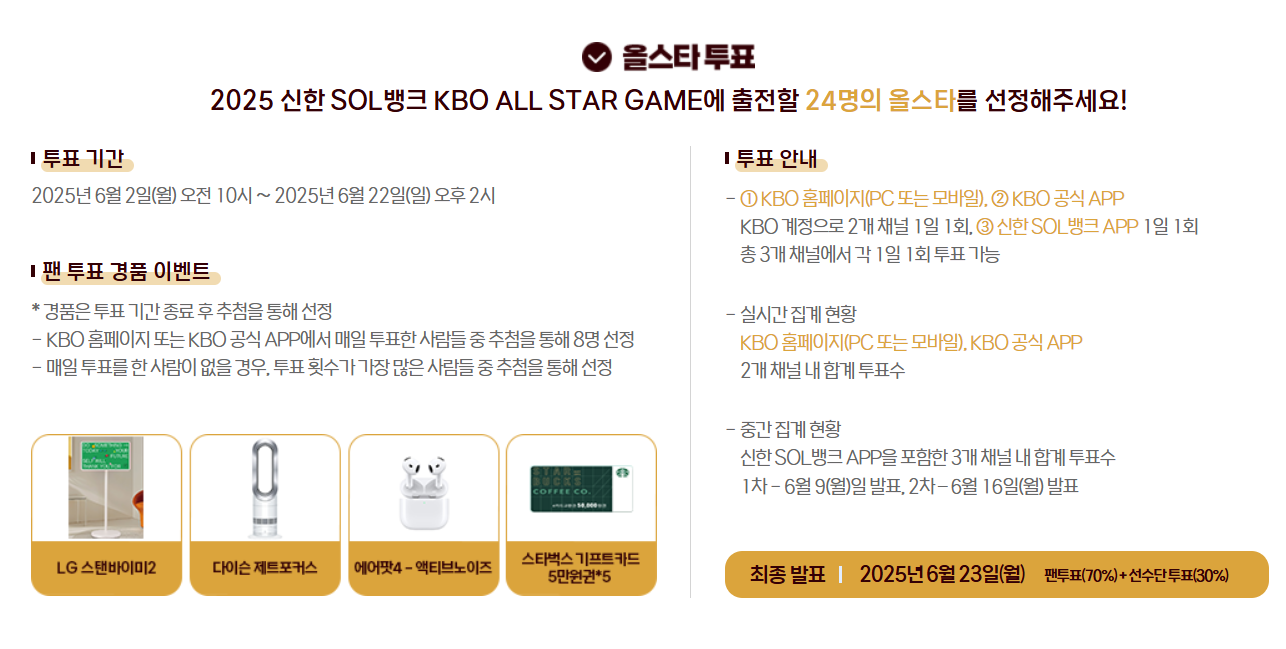 한 달여 정도를 남겨둔 이 시점에 프로야구 2025 KBO 올스타 투표로 열기가 점점 뜨거워지고 있습니다.