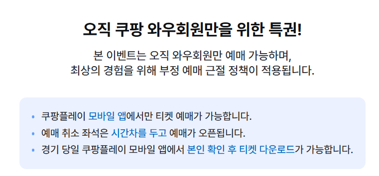 따라서, 정규 선예매와 예매 기간에 티켓팅에 실패했을지라도, 포기하지 말고 실시간으로 쿠팡플레이 모바일 앱에서 취소 잔여석을 확인하다 보면 티켓팅에 성공할지도 모른다.