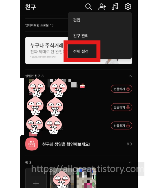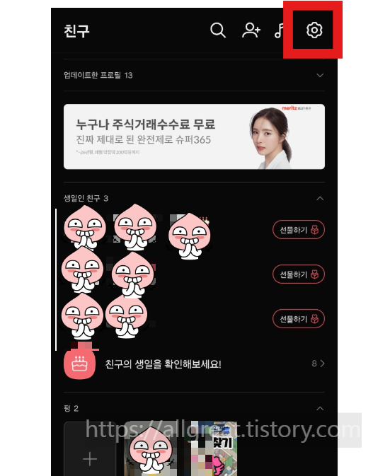 많이 익숙한 화면이죠? 카톡 친구 메인화면입니다.