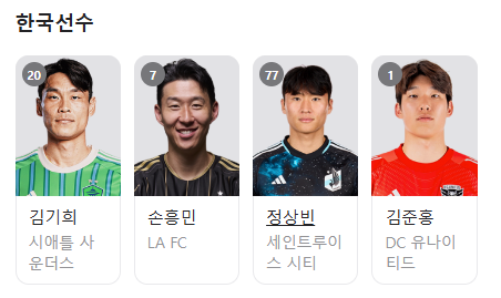 현재 미국프로축구 MLS에서 뛰고 있는 소속 한국인선수는 총 4명이다. 손흥민, 김기희. 정상빈, 김준홍이다.
