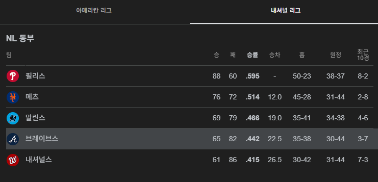 NL 동부지구 5개 팀 중에서 4위를 기록하고 있는 애틀란타는 포스트시즌(가을야구)이 물건너간 상태이다.