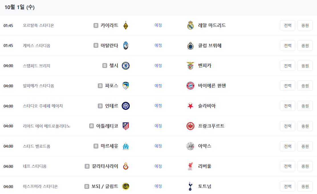 10월 1일 챔피언스리그 경기 일정