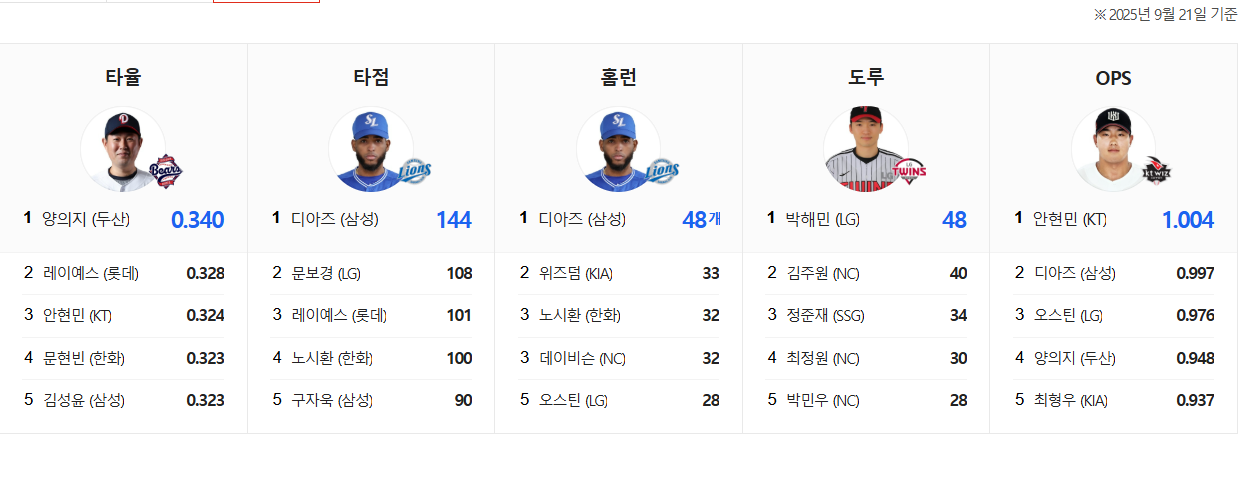 타자 주요 개인성적을 보면, 타율 1위 양의지 / 타점 1위 디아즈 / 홈런 1위 디아즈 / 도루 1위 박해민 / OPS 1위 안현민.