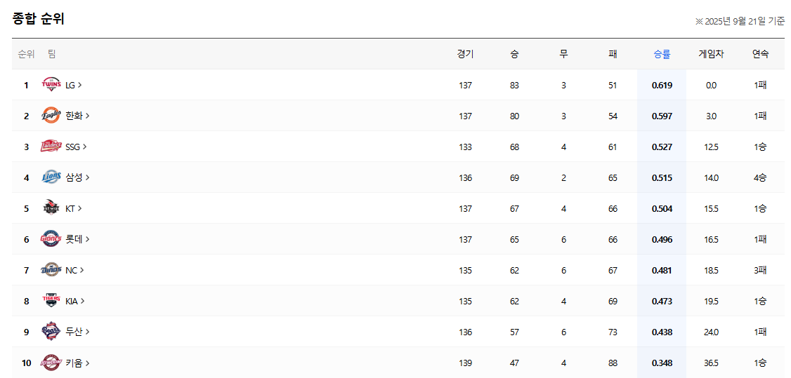 1위 LG의 정규리그 우승이 가장 유력한 가운데, 2위 한화, 3위 SSG, 4위 삼성, 5위 KT, 6위 롯데다.
