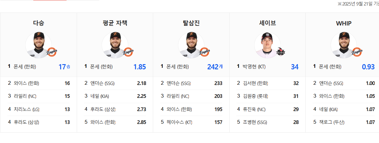 다승 1위 폰세 / 평균자책 1위 폰세 / 탈삼진 1위 폰세 / 세이브 1위 박영현 / WHIP 1위 폰세.