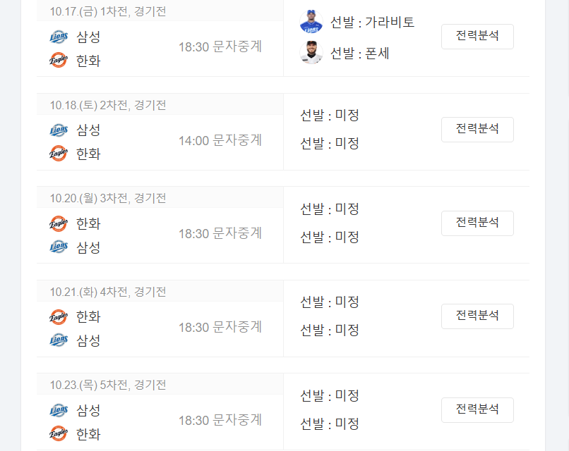 5전 3선승제로 진행되는 플레이오프 삼성 한화 경기는 10월 17일 금요일 1차전을 시작으로 진행된다.