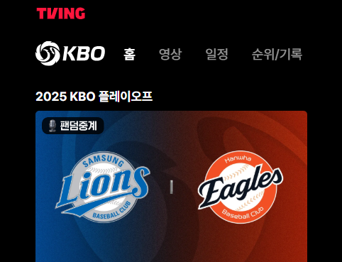 프로야구 중계 OTT 스트리밍 라이브 방송 전문 채널이 되버린 티빙 스포츠를 통해서 2025 KBO 플레이오프 삼성 한화 경기를 중계 시청할 수 있다.