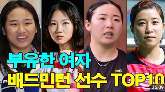 위 영상 역시 섹시 미녀 배드민턴 여자선수 모음이다. 일본선수가 나온다는 게 아쉽지만, 우리나라 여자 배드민턴 선수는 재산 부유함 기준으로 정리해 놓은 영상을 아래에 링크해 두었다.