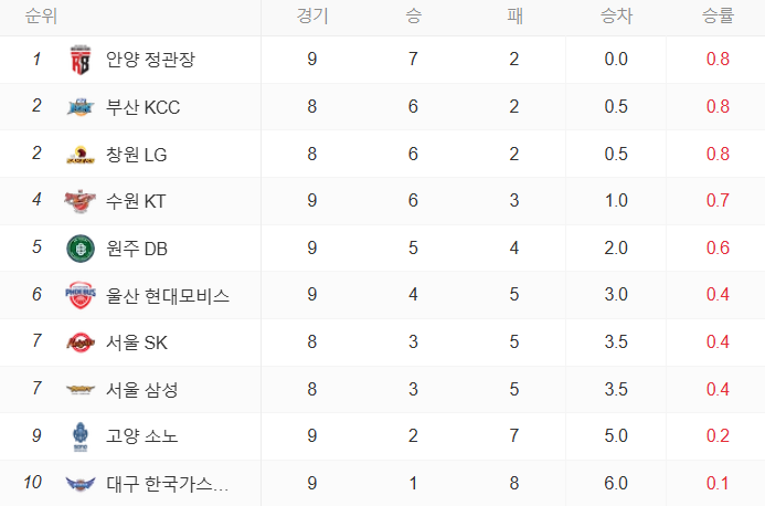 아직 10 경기도 채 진행되지 않은 남자 농구다. 그래서 승차가 많이 나지는 않지만, 올시즌 선두권으로 예상되는 팀은 안양 정관장, 부산 kcc, 창원 lg, 수원 kt, 원주 DB로 압축되지 않을까 예상된다.