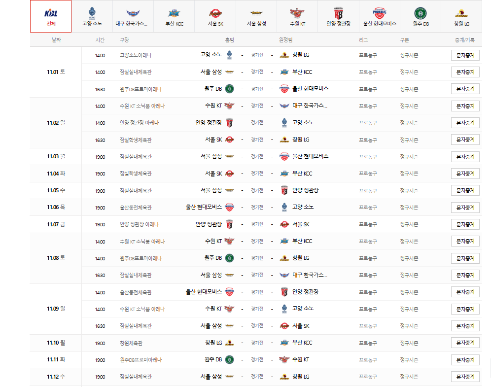 오늘 기준으로 프로농구 팀별 전체 순위, 10월 및 11월 경기일정을 정리해 보았다.