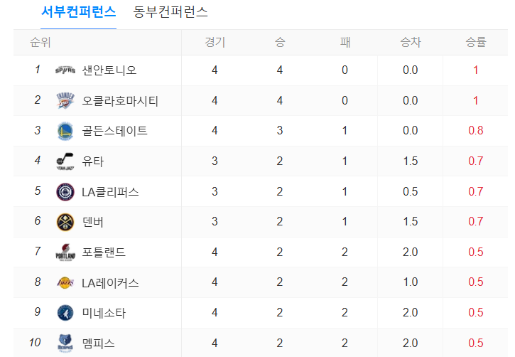 시즌 개막 전부터 예상했던 팀들이 상위권에 많이 보입니다. 1위부터 나열해 보면 샌안토니오, 오클라호마시티, 골든스테이트, 유타, LA클리퍼스, 덴버, 포틀랜드 순으로 이어집니다.