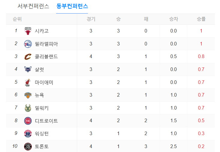 동부콘퍼런스 역시 15개 팀 중 1위부터 순서대로 나열해 보면, 시카고, 필라델피아, 클리블랜드, 샬럿, 마이애미, 뉴욕, 밀워키 순으로 이어집니다.