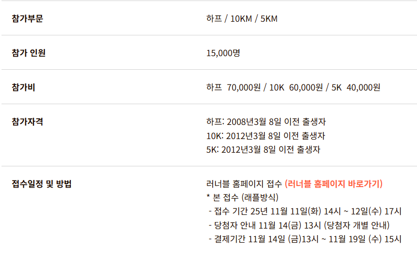 하프 마라톤 참가비는 하프 7만원, 10키로 6만원, 5키로 4만원이며, 약 15,000명의 대규모 인원이 함께 달리게 됩니다.