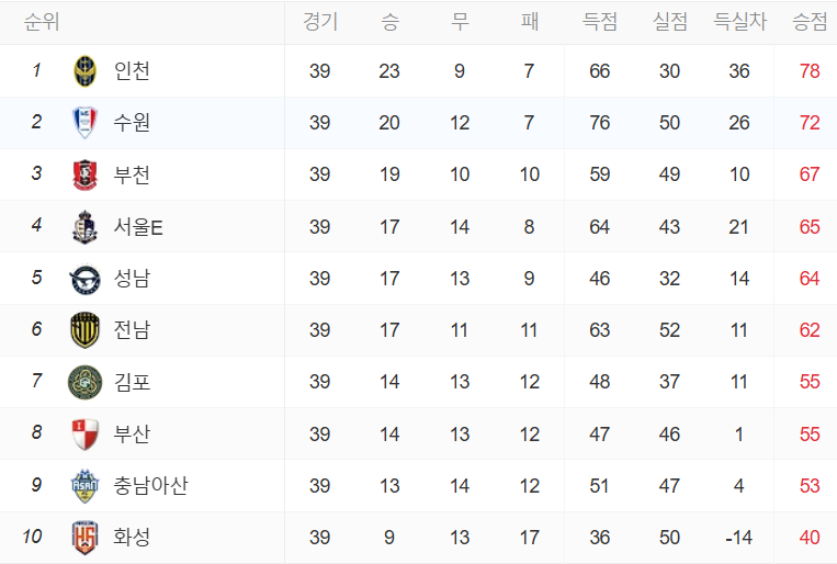 K리그2 정규리그 최종 순위가 확정되었다. 1위 인천 유나이티드, 2위 수원삼성, 3위 부천FC, 4위 서울 이랜드 순이다.