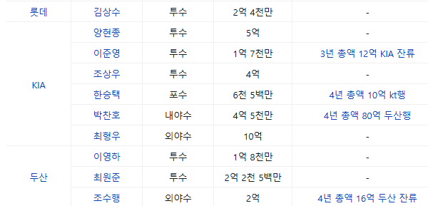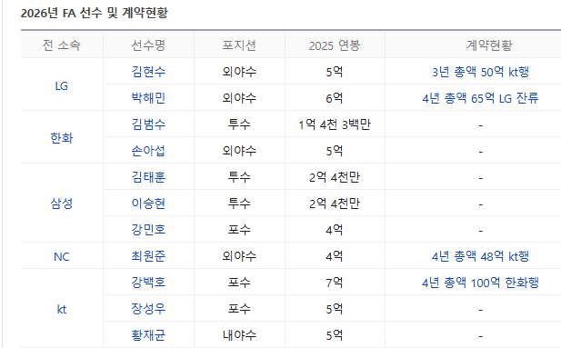 포스팅을 작성하는 현재 기준으로 FA계약 대상 선수들 중에서 계약을 완료한 선수는 절반 정도이다.