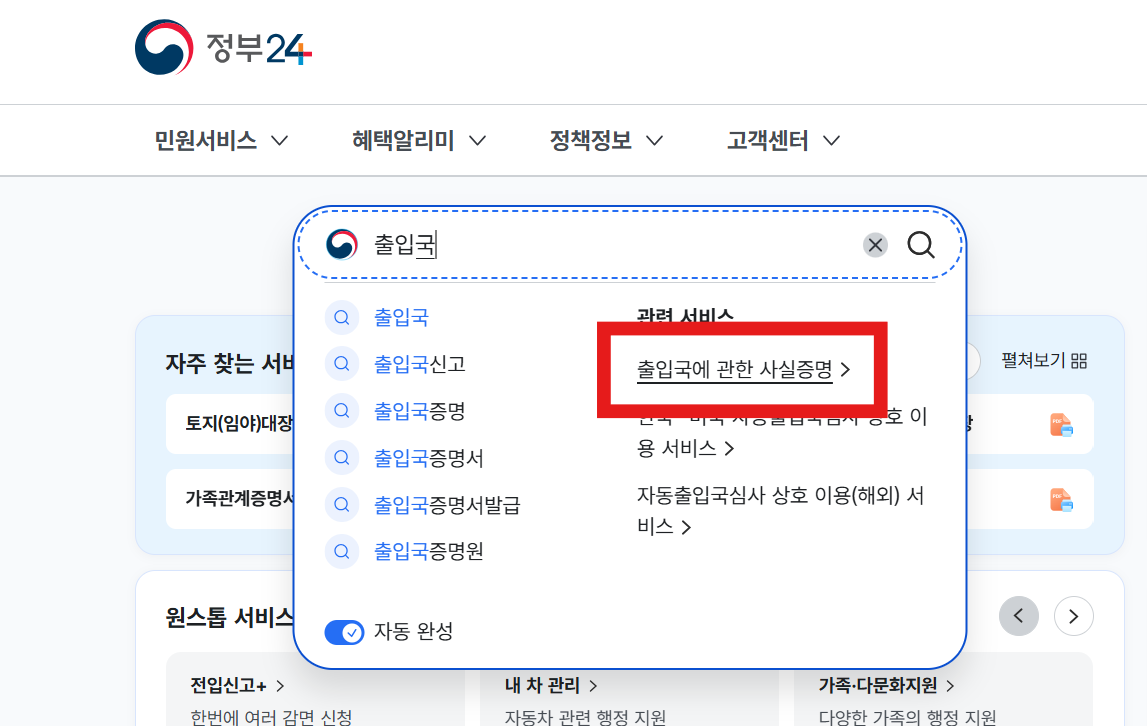 위 화면은 정부24 홈페이지 메인화면인데, 검색창에 '출입국'이라고만 입력해도 바로 연관 카테고리로 '출입국에 관한 사실증명'이라는 메뉴가 뜹니다.