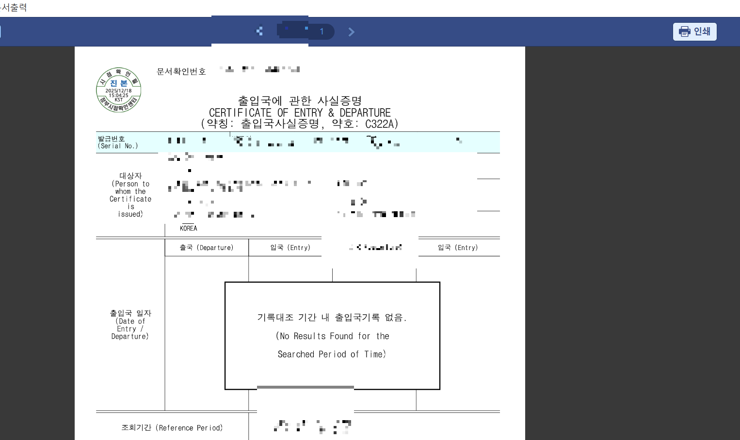 출입국일자 항목에 '기록대조 기간 내 출입국기록 없음.'이라고 나옵니다.