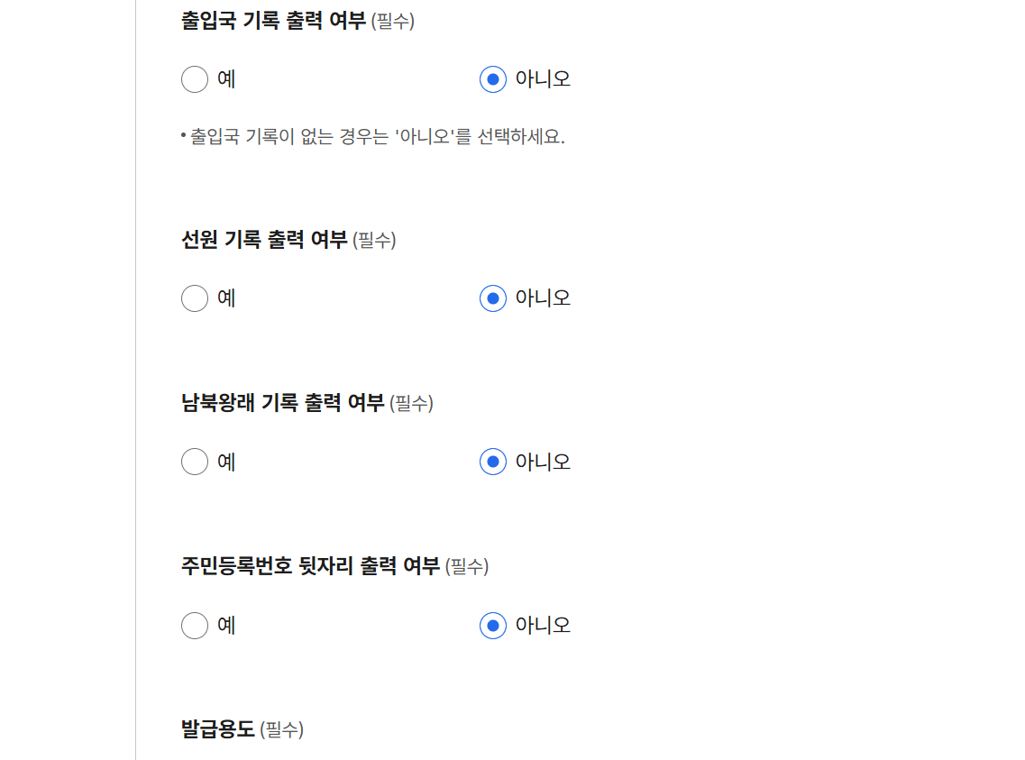 해외 출국 출입국기록이 없음을 증명하기 위해서 출입국사실증명원을 발급받는 것이라면, '출입국기록 출력 여부'항목에서 '아니오'를 체크해야합니다!