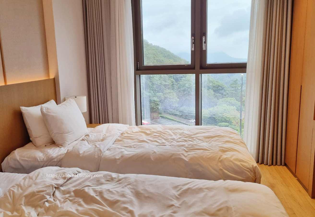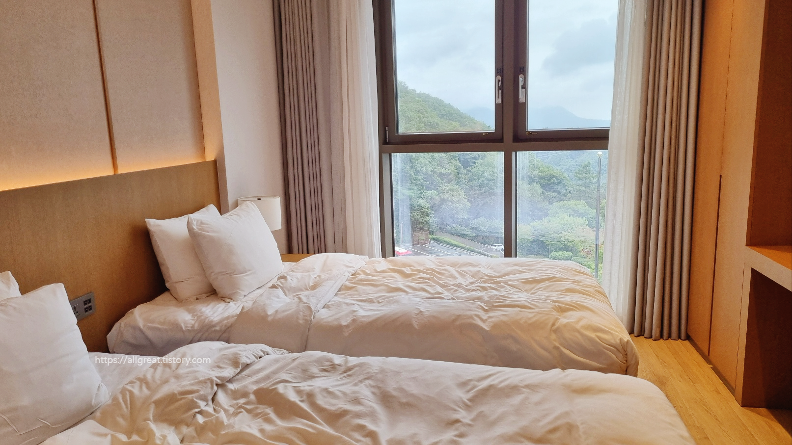 제가 머물렀었던 리솜 레스트리 타워클린 호텔 침실 방의 실내 모습입니다.
