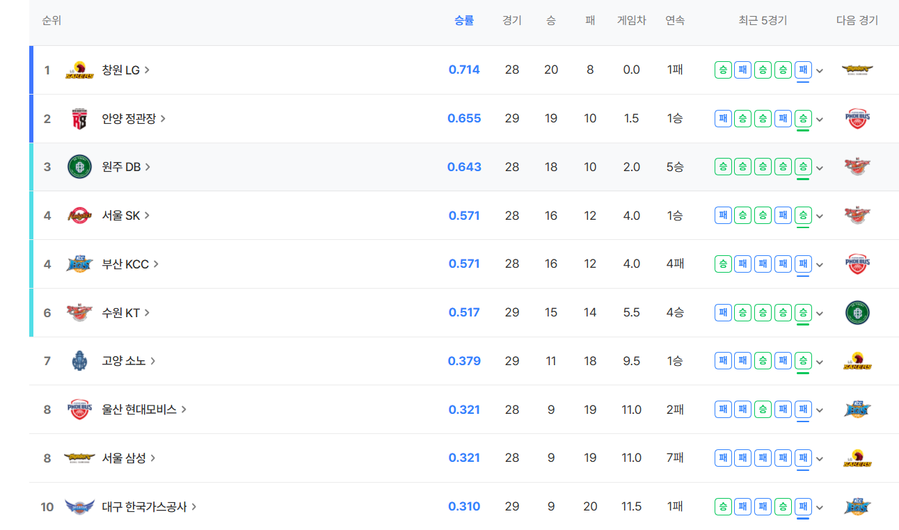포스팅을 작성하는 오늘 기준으로 1위 창원LG, 2위 안양 정관장, 3위 원주DB, 4위 서울 SK / 부산KCC 순이다.