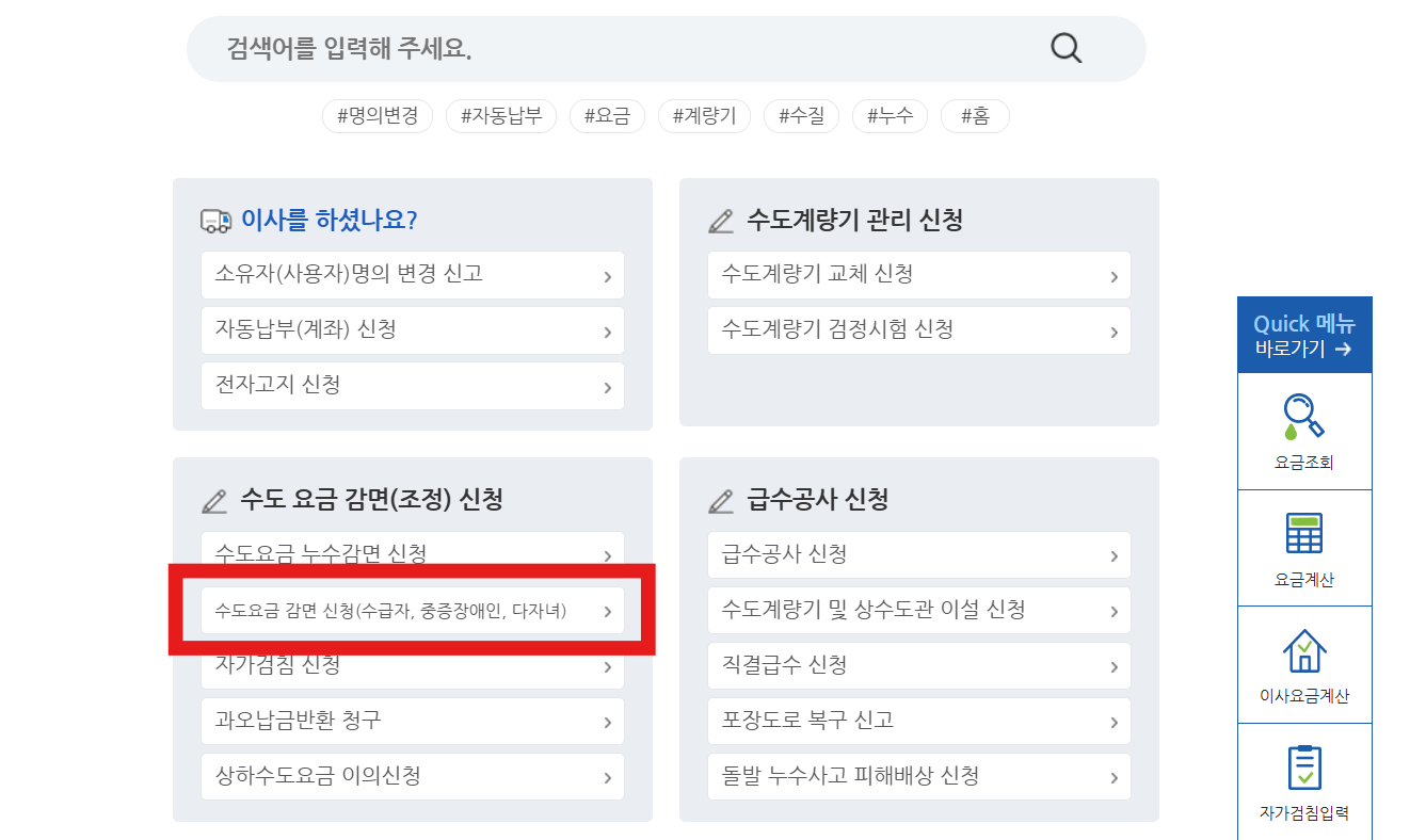 여기서 수도요금 감면(조정) 신청 하목의 하위 메뉴들 중에서 '수도요금 감면 신청(수급자, 중증장애인, 다자녀)'메뉴를 클릭합니다!