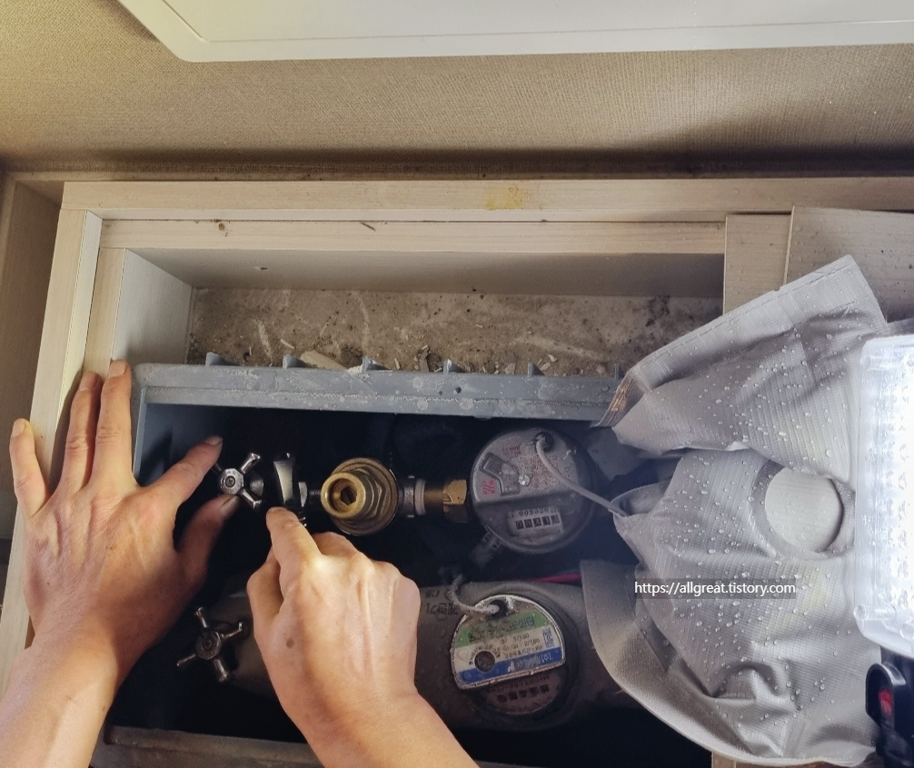 감압밸브 역시 현관수납장 바닥 부분에 수도조절 장치들과 함께 연결되어 있습니다.