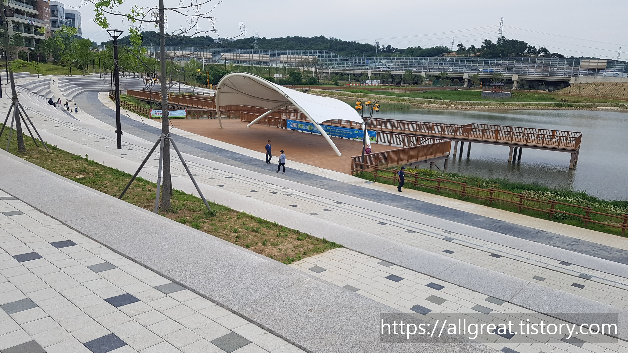 한강시민공원 야외 공연장만큼은 아니지만, 제법 한강 물빛광장 느낌으로 야외콘서트 공연장을 만들어놨다. 야외공연장 뒤로는 나무 데크로 수변로가 조성되어 있다.