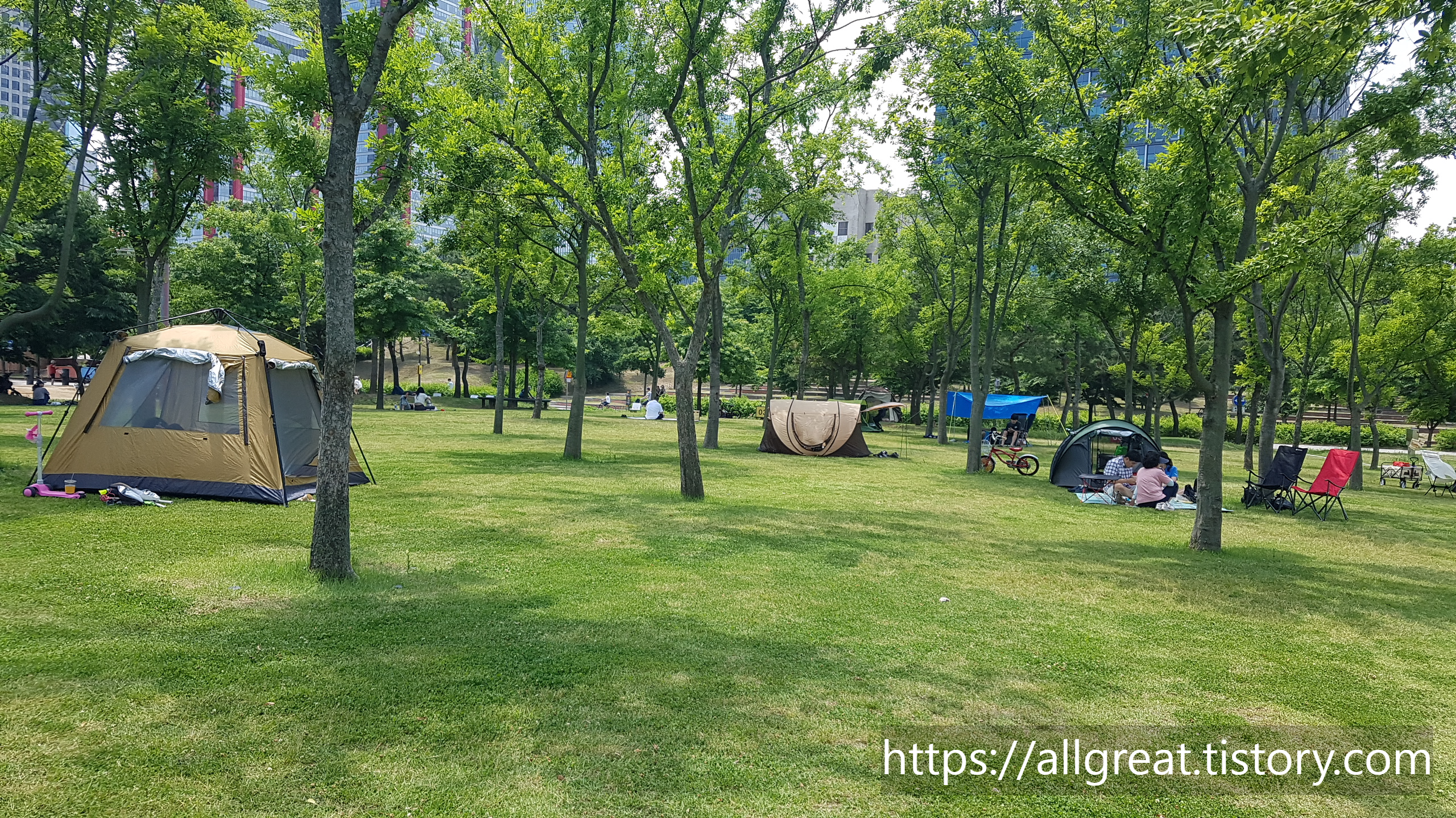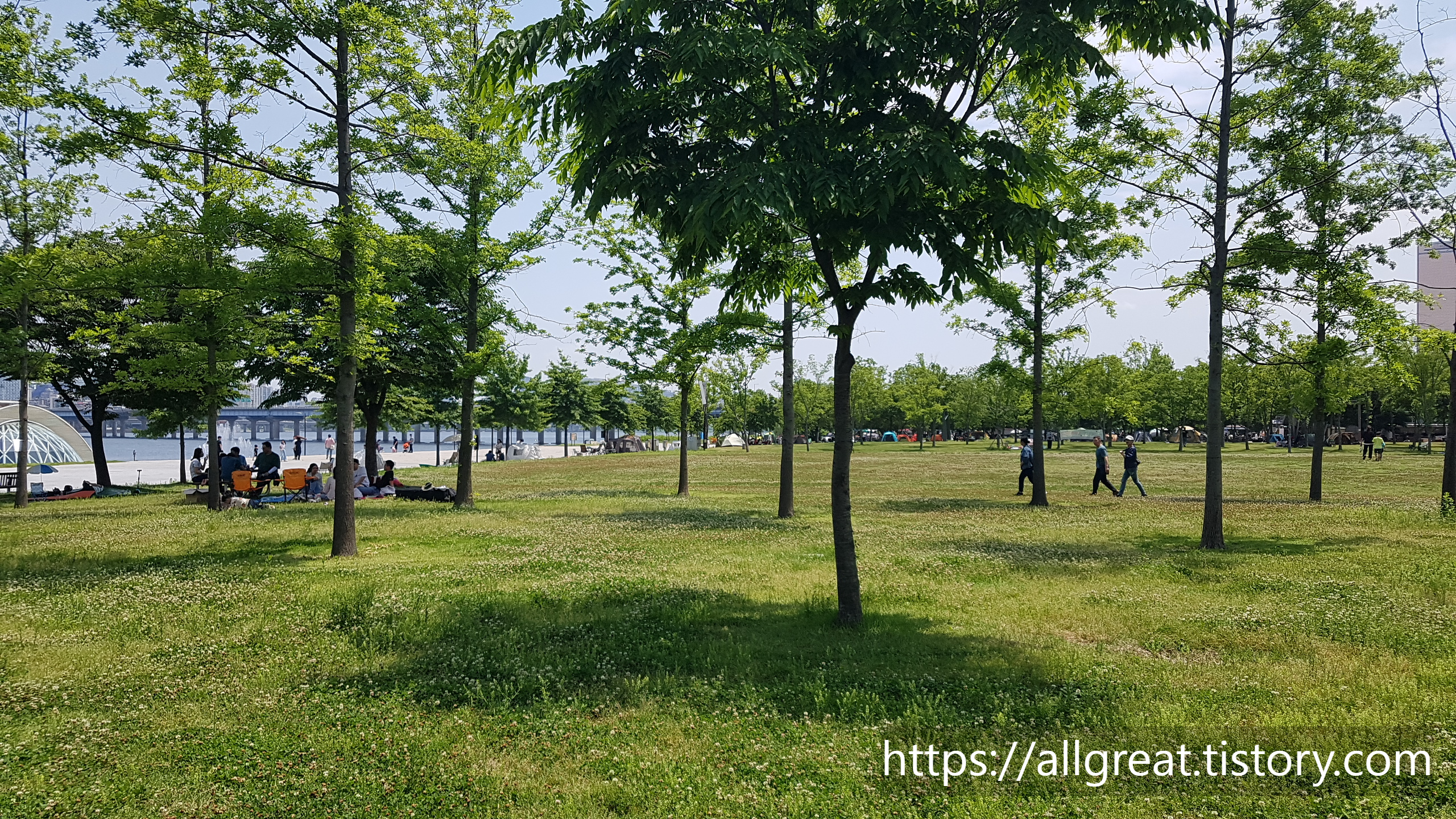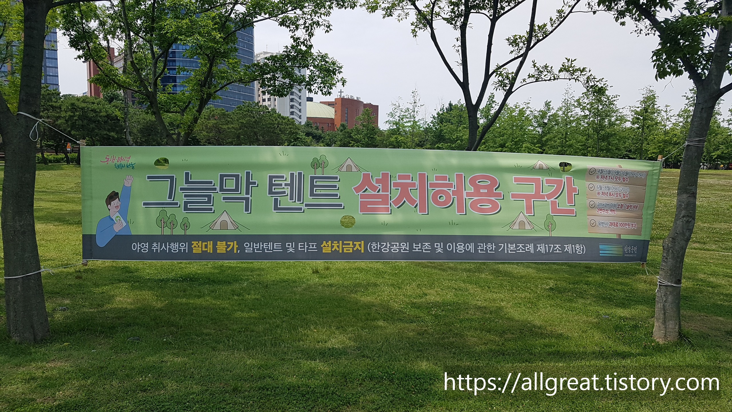 여의도 한강시민공원 잔디밭은 그늘막 텐트 설치가 가능한 허용구간이 별도로 지정되어 있다. 다행히 물빛광장에서도 가까운 곳에도 그늘막텐트를 설치할 수 있는 장소가 있어서 물빛 물놀이터를 방문한 가족들도 편리하게 이용할 수 있다.