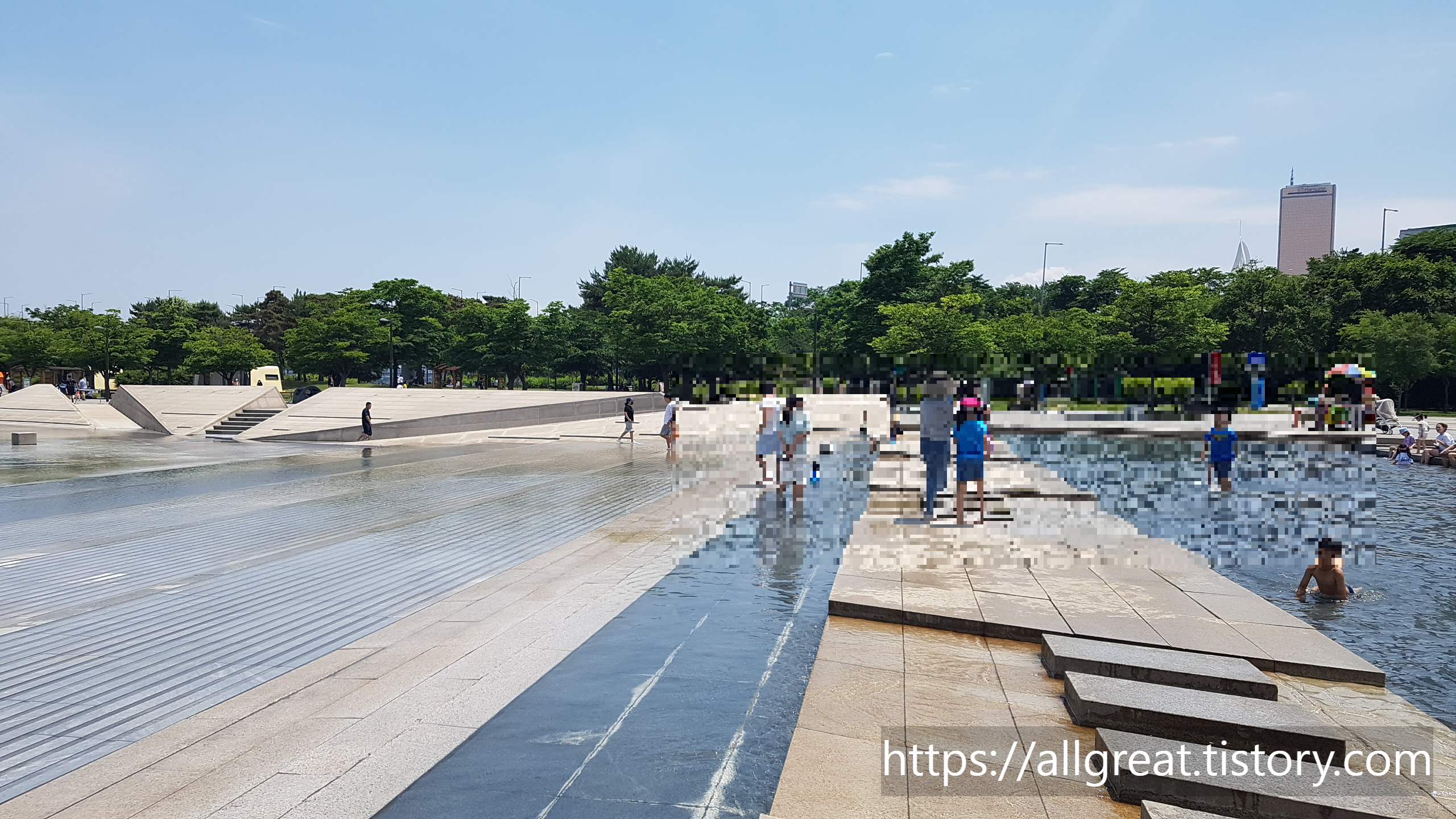 서울 도심속에서 이만한 야외 무료 물놀이터가 있나 싶을 정도로 깨끗한 수질과 규모를 자랑하는 여의도한강원공원 물빛광장 물놀이터다. 탁 트인 한강뷰 물빛광장에서 물놀이하는 아이들을 바라보고 있으면, 해외 유명 호텔의 워터파크 물놀이장이 안 부럽다. 파란 하늘과 여의도의 높은 빌딩숲을 배경으로 한강변 물놀이터에서 물장구치는 아이들을 바라만 보아도 흐뭇해진다.