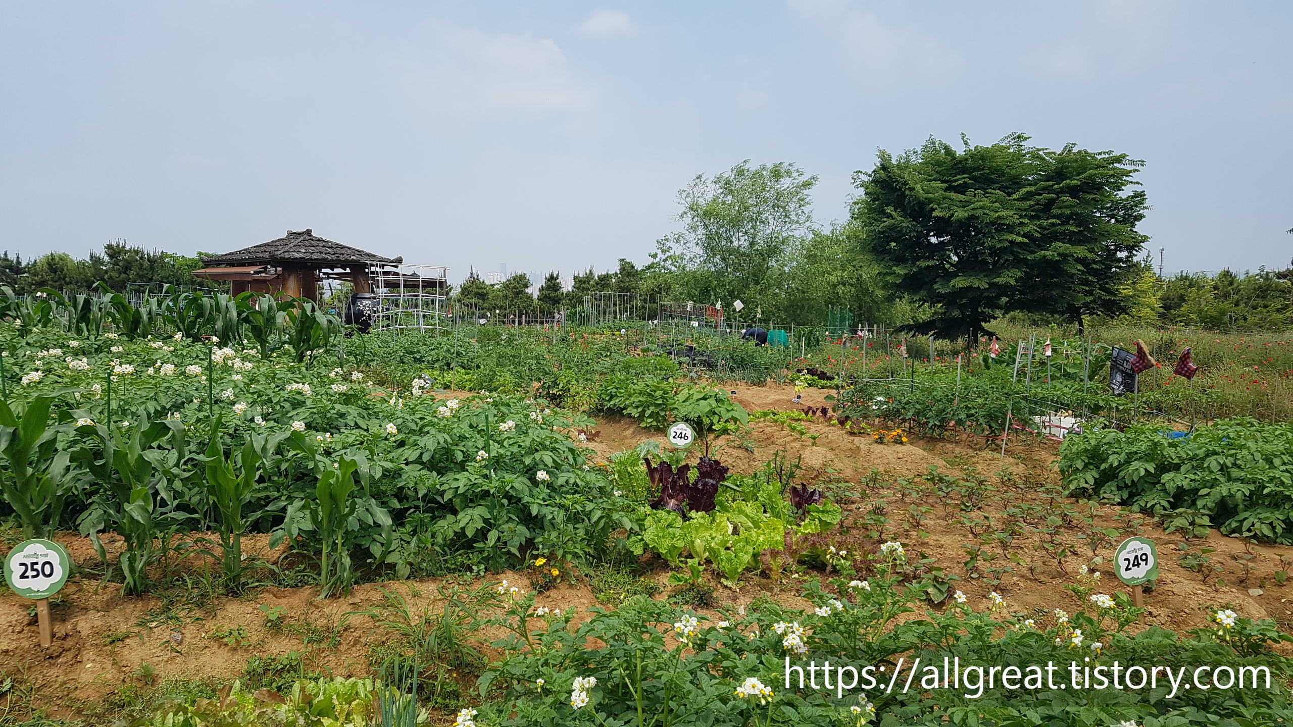 주말농장 텃밭의 전체 면적이 넓어서 많은 사람들이 배정받은 밭에 다양한 식물과 농작물들을 심어놔서 아이들의 자연체험 현장학습 장소로도 제격이다.