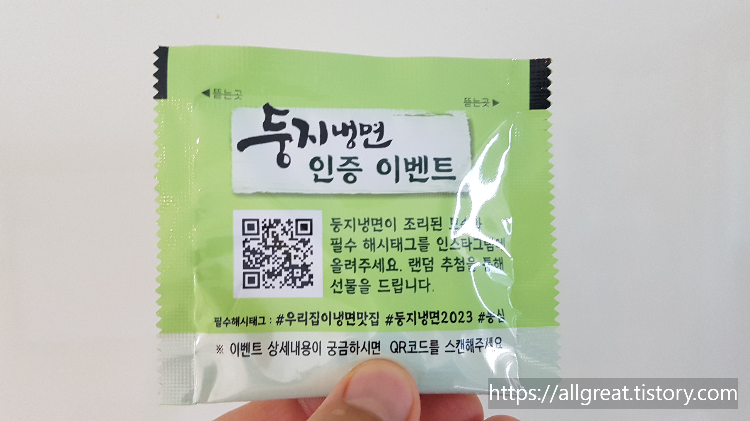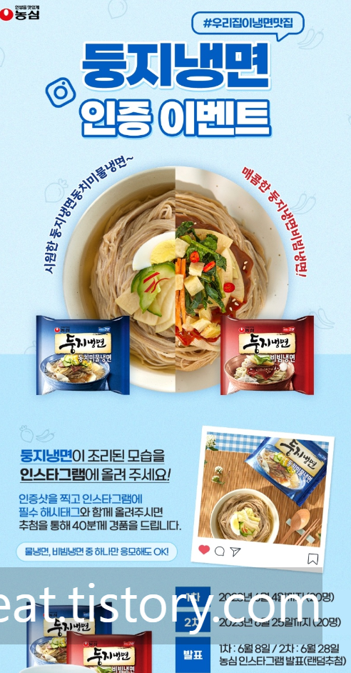어릴 적 "짜라짜짜 짜~파게티! 일요일은 내가 요리사!" 하며 티브이광고로 보았던 농심 짜파게티를 집에 있을 때 자주 먹었듯이 무더운 여름철에 나를 냉면요리사로 만들어준 둥지냉면이다. 어느 주말 늦은 점심식사로 둥지냉면을 먹으려고 포장지를 뜯던 중 '둥지냉면 인증 이벤트' 문구를 발견하였다.