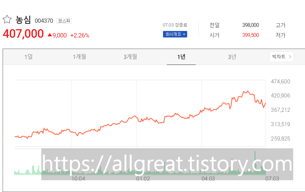 지금껏 식품업계에서 한 번 인상한 가격을 인하한 경우는 매우 이례적이라고 한다. 이렇게 농심이 가격인하를 발표하자 시장에서는 악재로 받아들였고, 농심주가는 일시 하락하였다. 그럼에도 국내 라면시장에서 압도적 1위를 달리고 있는 농심이기에 올해 안으로는 충분히 전고점을 뚫고 상승하리라 예상한다.