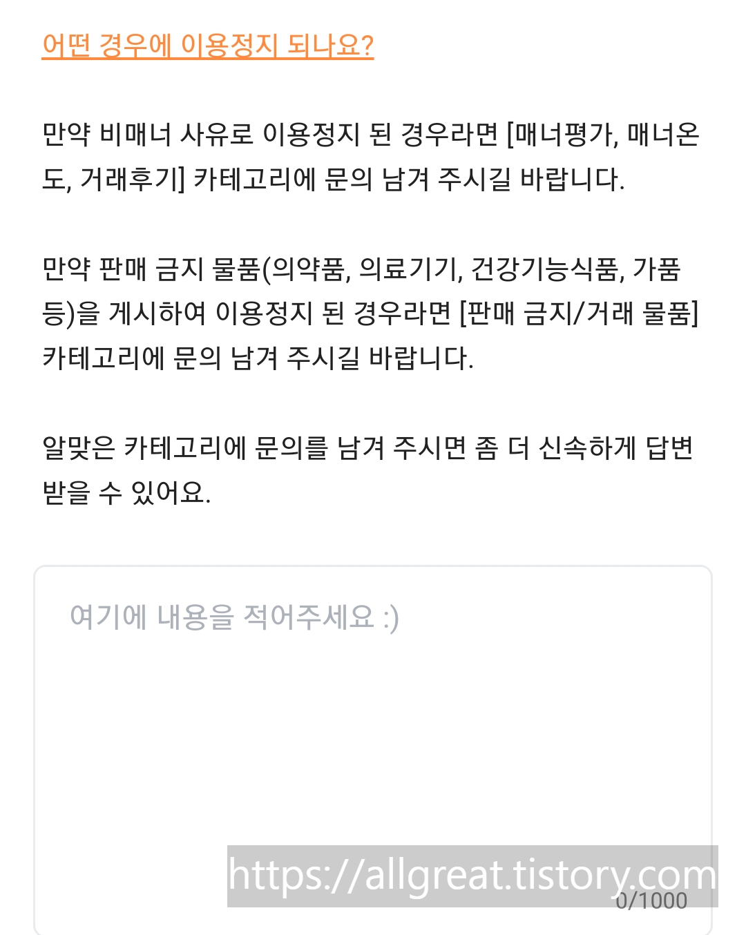 최대 1,000자까지 작성할 수 있는 입력란이 나온다. 이곳에 자신이 억울하고 부당하게 당근 측으로부터 제재를 당한 것을 적어주면 된다.